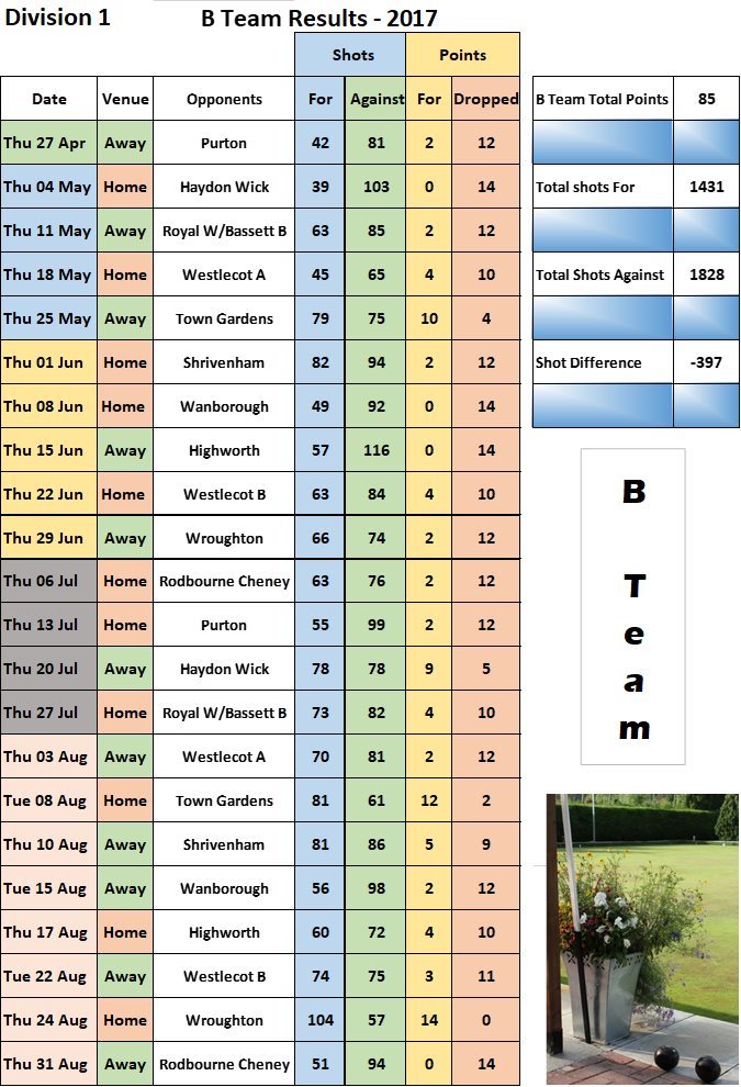 Stratton Churchway Bowls Club - S&D Rinks B Team Results 2017